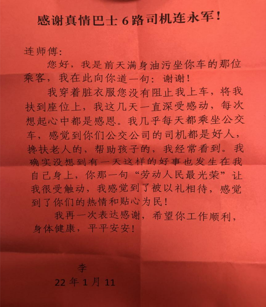 1月9日,青岛西海岸新区真情巴士6路驾驶员连永军驾驶公交车,执行由海上嘉年华东发往柳花泊西的运营任务。车辆行驶至澳柯玛工业园站点时,上来一位身穿工作服的乘客李先生,李先生上车后并未找空座坐下,而是在车厢里站了一会,便走到后门附近的台阶上席地而坐。连永军师傅通过后视镜发现提醒让他坐到座位上,李先生因自己满身油污怕弄脏座椅谢绝了好意。连师傅停下车走到李先生旁边说:“坐吧、坐吧,不要紧,劳动都是光荣的”。扶李先生坐好后,看到其口罩有污损,连师傅又回到驾驶室取了新口罩送给他。小小的车厢内,乘客为他人着想担心弄脏座椅,司机尊重体谅乘客为其提供贴心服务,两人之间的互动温暖了彼此,也感动了整车乘客。1月11日,在澳柯玛工业园工作的李先生,没有留下姓名和联系方式,到公司送来一封感谢信后便匆忙离开,信中写到:我感觉到了被以礼相待,感觉到了你们的热情和贴心为民……