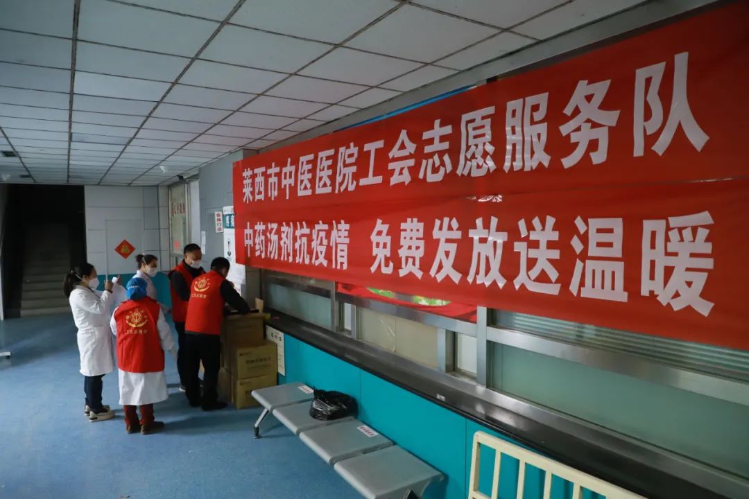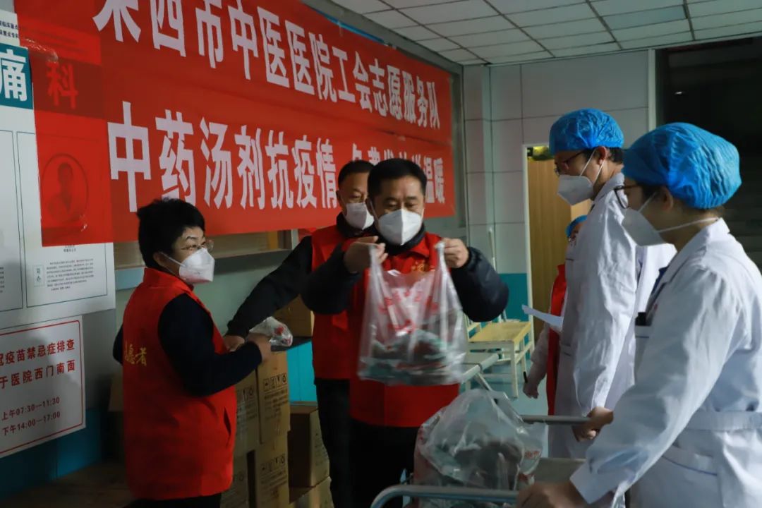 12月15日上午,莱西市中医医院工会志愿者将首批2千余袋温热的防疫中药汤剂,送给全院广大干部职工服用,益气固表,辛凉御邪,增强抵抗力,为全院干部职工筑起一道疫情防控守护屏障。