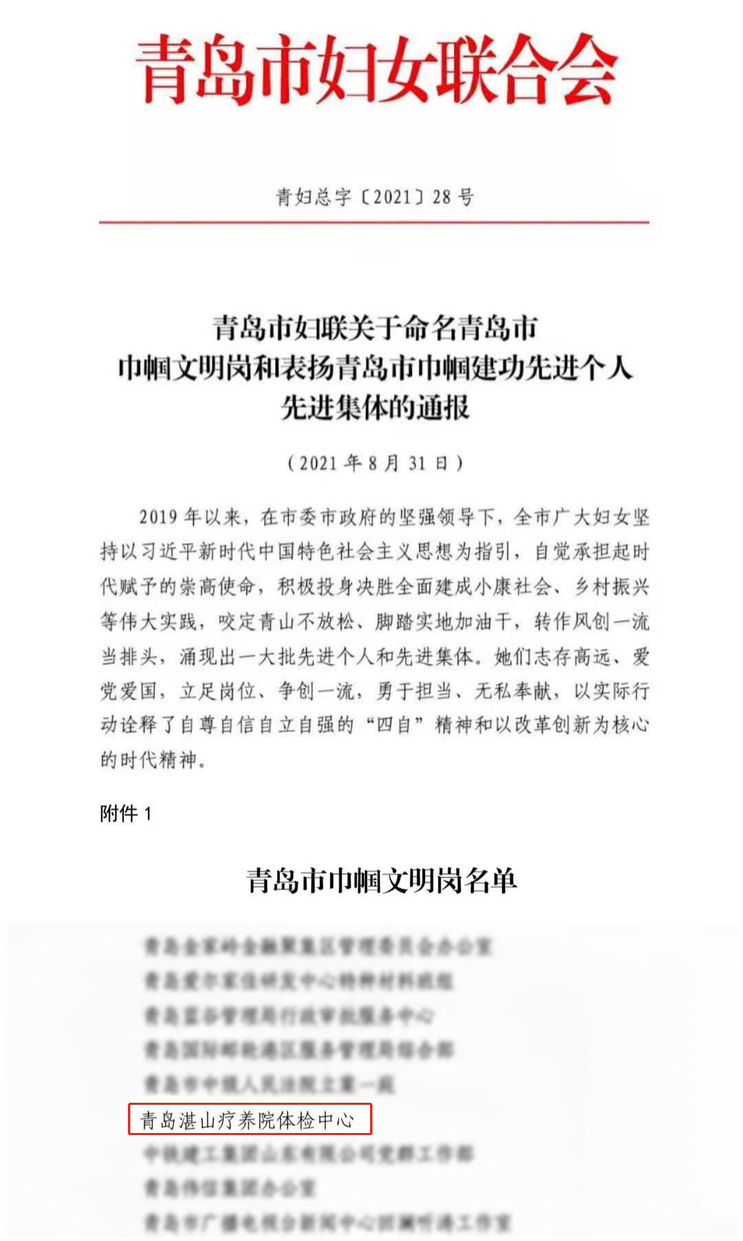 日前,青岛市妇联发布《青岛市妇联关于命名青岛市巾帼文明岗和表扬青岛市巾帼建功先进个人先进集体的通报》,青岛湛山疗养院体检中心获得“青岛市巾帼文明岗”荣誉称号。