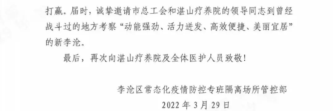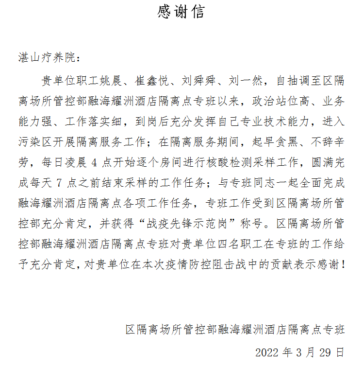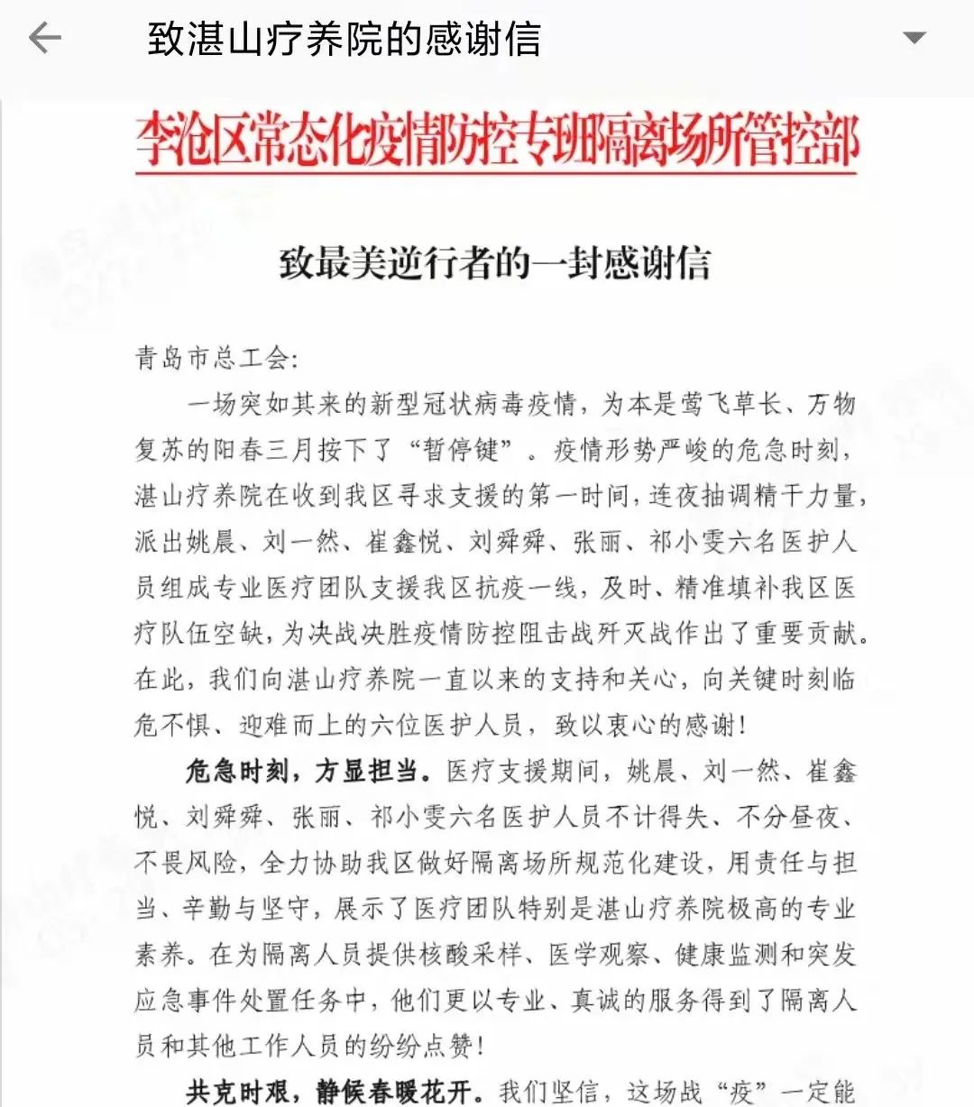 李沧区隔离场所管控部和酒店隔离点专班的领导为赴李沧区疫情防控隔离酒店的湛疗一线医护人员举行简短欢送仪式并献上鲜花,同时李沧区隔离场所管控部和酒店隔离点专班向青岛市总工会、青岛湛山疗养院发来感谢信,对湛疗的一线医护人员表示感谢,在进入污染区开展隔离服务期间,她们起早贪黑、不辞辛劳,每日凌晨4点开始逐个房间进行核酸检测采样工作,圆满完成每天的工作任务。