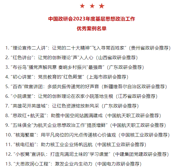 据悉,经中央宣传部领导批准,中国政研会秘书处组织开展了2023年度基层思想政治工作优秀案例评选工作。经认真评选,共确定80个案例为中国政研会2023年度基层思想政治工作优秀案例。